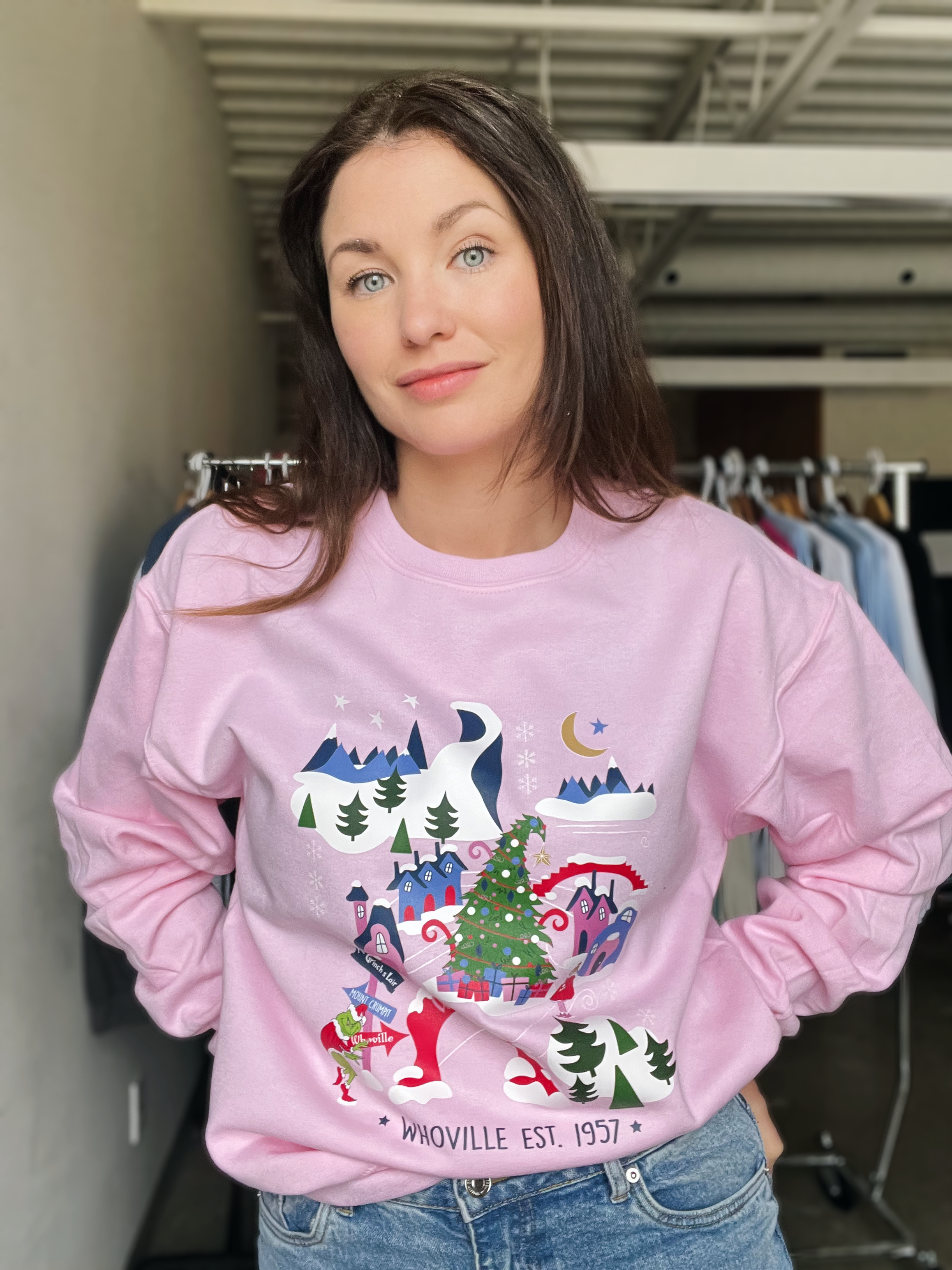 Show off your love for the Grinch and WhoVille with this adorable crewneck. You'll love spending the cold season warm and cozy in a cozy retro sweatshirt. A perfect crewneck for Christmas movie lovers.