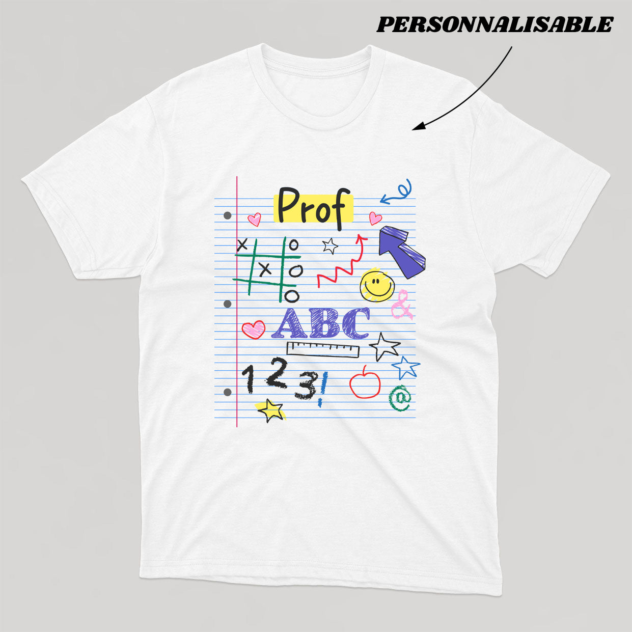 Ce t-shirt ludique et coloré recrée l’univers d’une page de cahier, avec ses gribouillis joyeux, ses jeux de tic-tac-toe, ses flèches, étoiles et smileys. L’inscription « Prof » peut être personnalisée selon le niveau scolaire de l’enfant — parfaite pour immortaliser cette nouvelle étape!