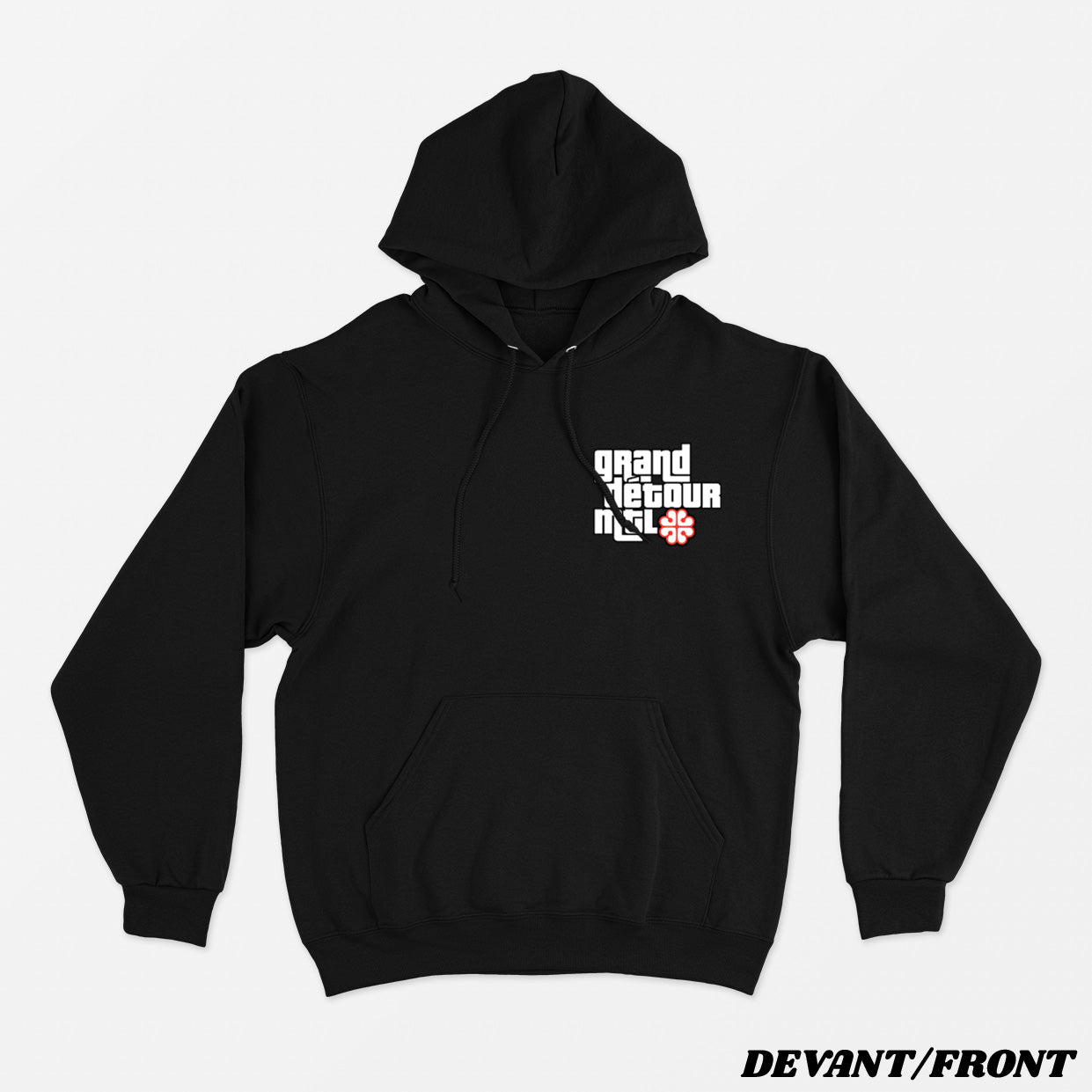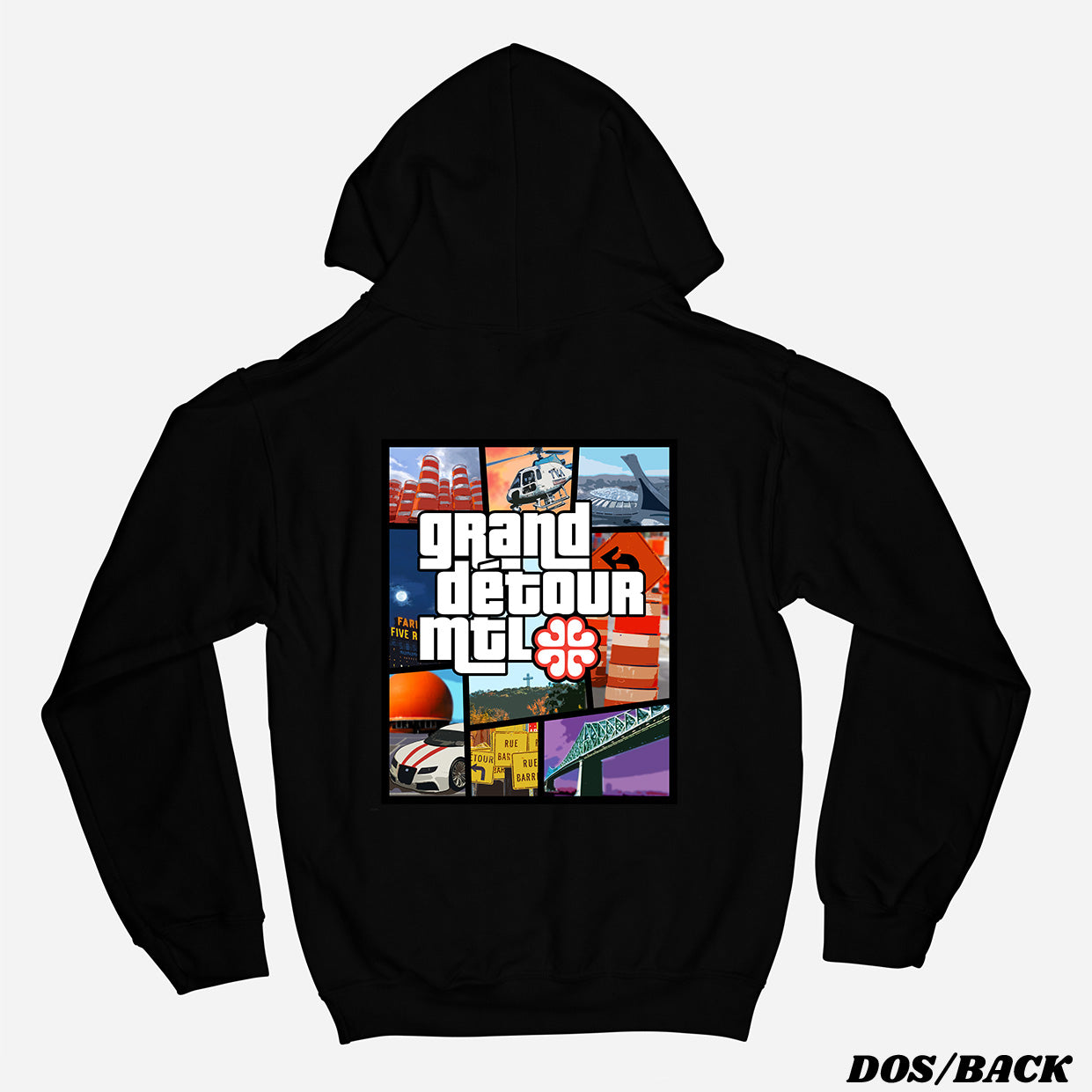 Un clin d’œil audacieux à la réalité bien connue des Montréalais : les détours sans fin, les cônes orange omniprésents et les chantiers éternels. Inspiré du style emblématique de Grand Theft Auto, ce chandail revisite avec humour le chaos routier de la métropole. On y retrouve des éléments familiers : panneaux de détour, pont Jacques-Cartier, cônes à perte de vue, et même la fameuse Orange Julep.