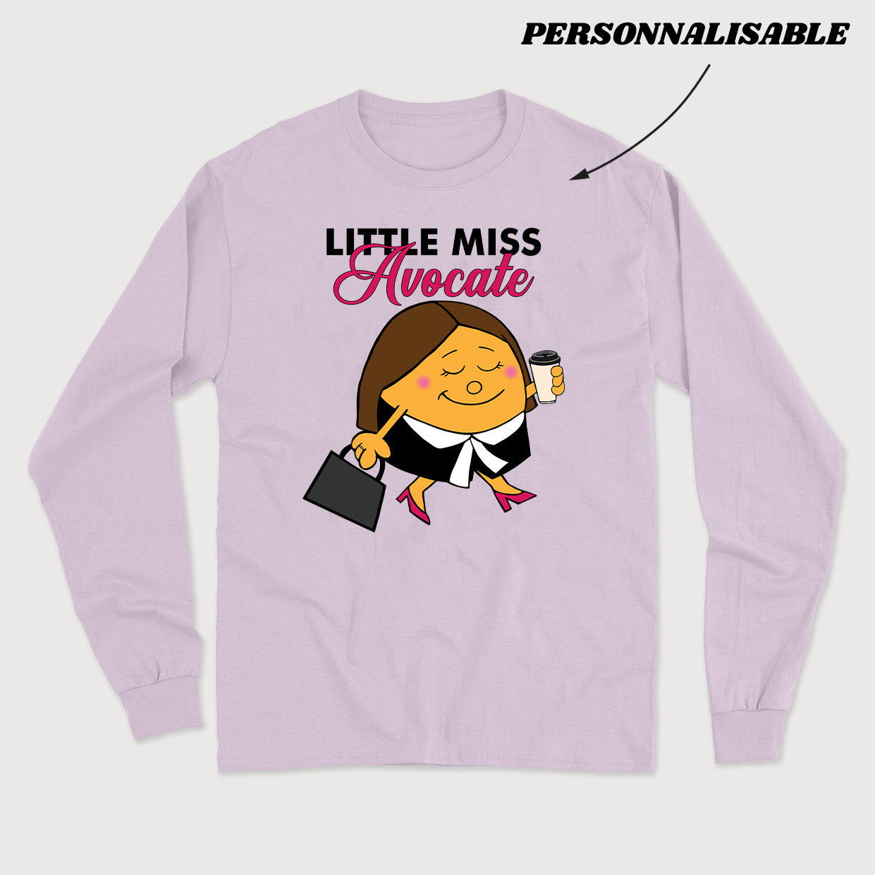 Personnalisez votre commande en indiquant en commentaire quel titre vous souhaitez donner à votre Little Miss. À noter que la section personnalisable est uniquement le mot AVOCATE, la section LITTLE MISS et le dessin sont fixes.
