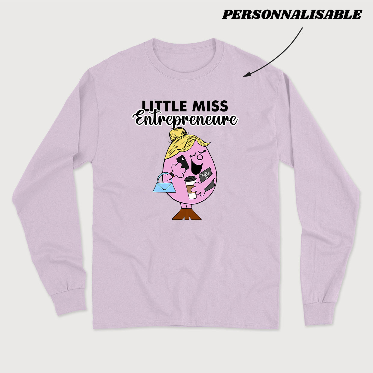 Personnalisez votre commande en indiquant en commentaire quel titre vous souhaitez donner à votre Little Miss. À noter que la section personnalisable est uniquement le mot ENTREPRENEURE. La section LITTLE MISS et le dessin sont fixes.