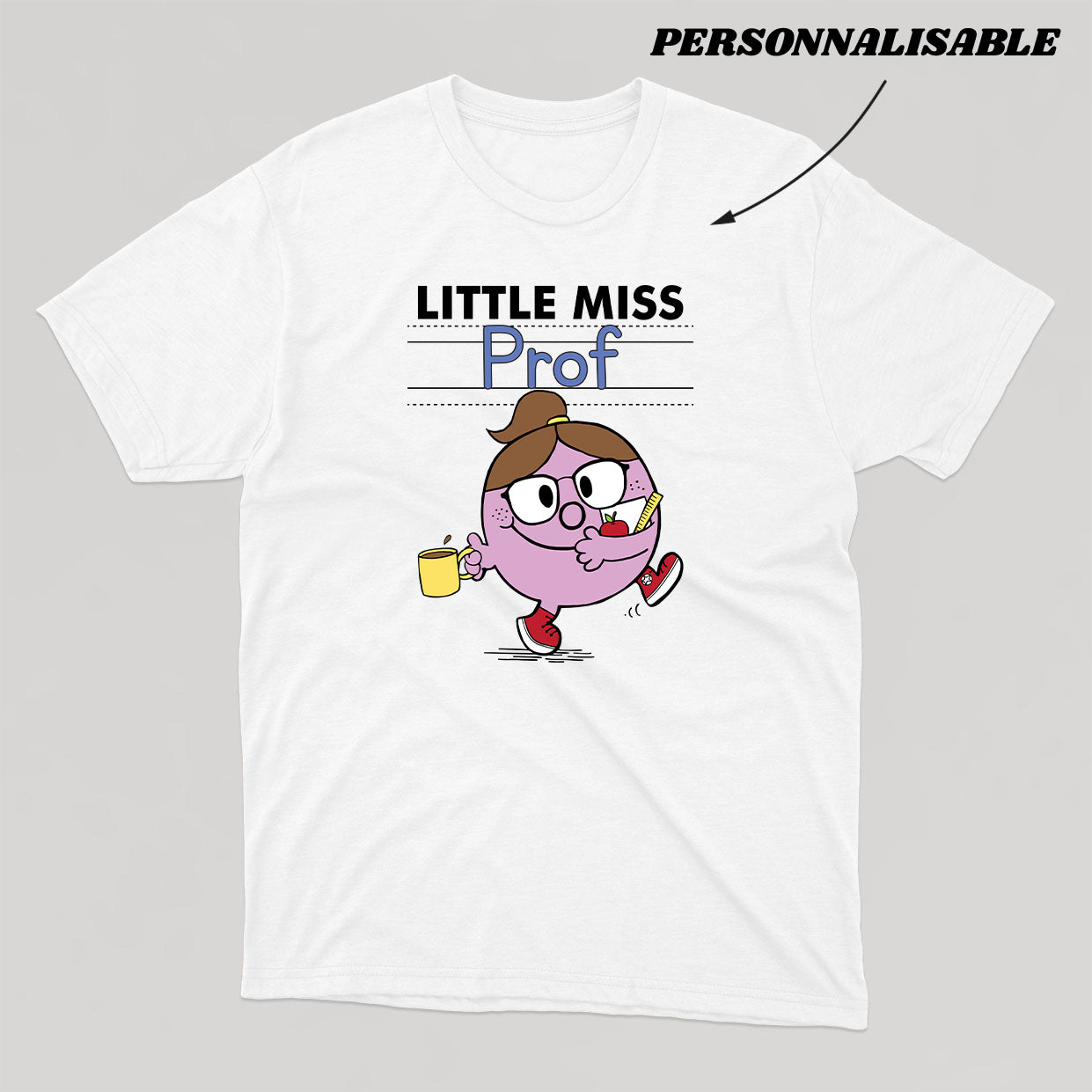 Personnalisez votre commande en indiquant en commentaire quel titre vous souhaitez donner à votre LITTLE MISS. À noter que la section personnalisable est uniquement le mot PROF, la section LITTLE MISS et le dessin sont fixes.