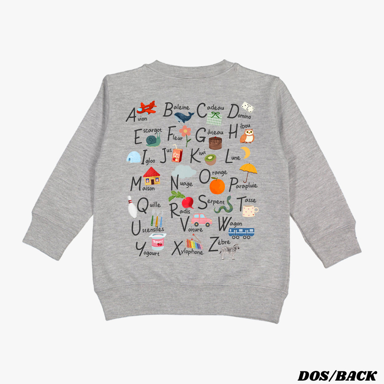 Un chandail fun et unique pour enfants et adultes ! L’arrière présente un abécédaire adorablement illustré pour apprendre en s’amusant, tandis que l’avant est personnalisable avec les mêmes dessins pour un look vraiment unique. Confortable et coloré, il célèbre la créativité et l’apprentissage pour tous les âges