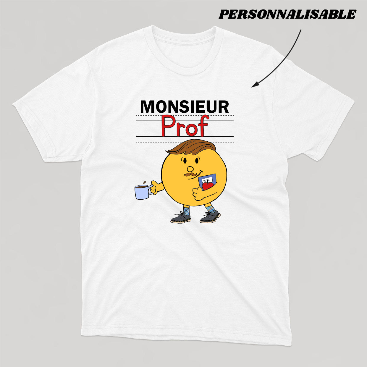 Personnalisez votre commande en indiquant en commentaire quel titre vous souhaitez donner à votre Monsieur. À noter que la section personnalisable est uniquement le mot PROF, la section Monsieur et le dessin sont fixes.