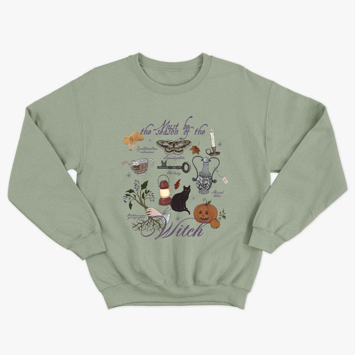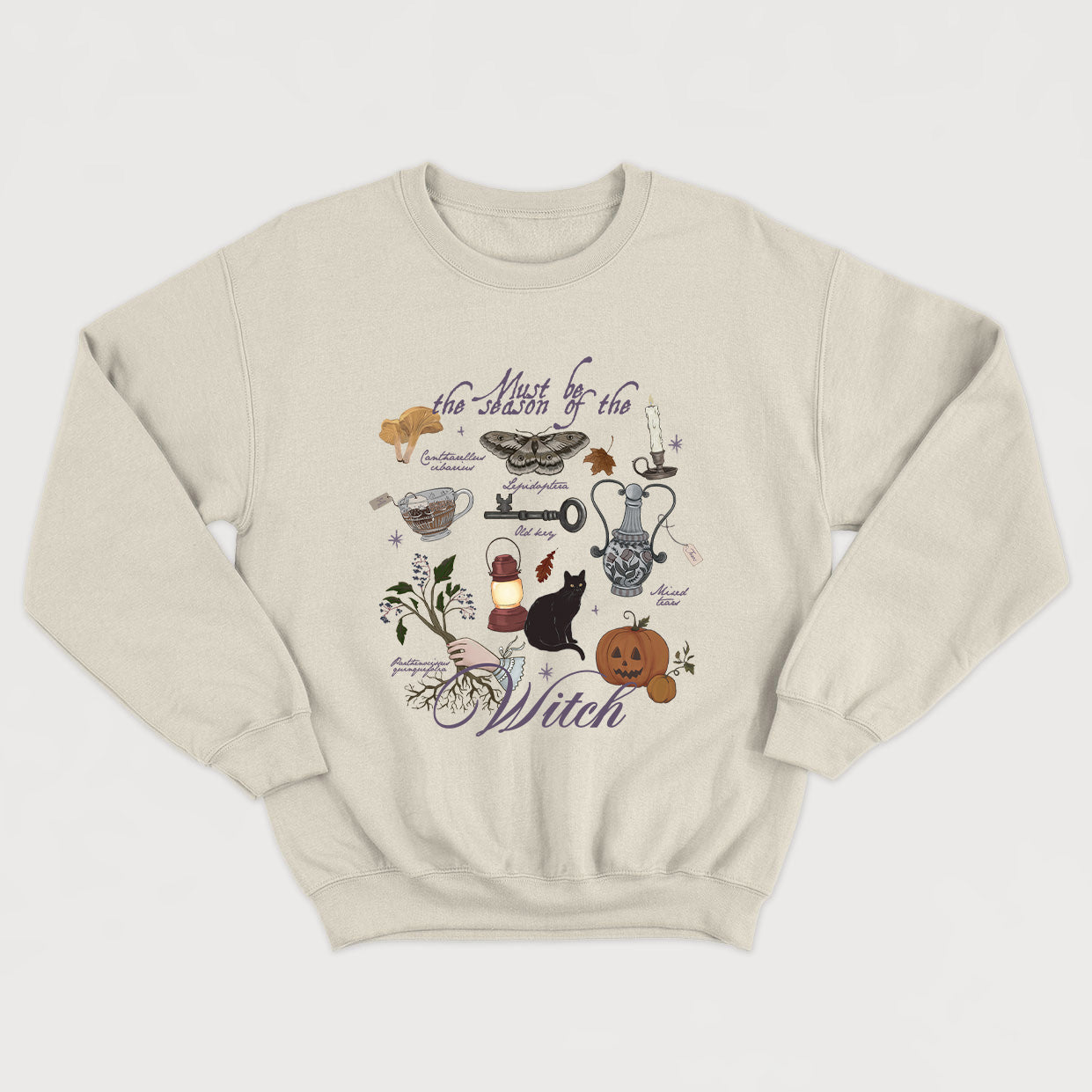 Ce crewneck doux et cosy est orné d'illustrations vintage inspirées de l’univers des sorcières : chat noir, lanterne, potions, citrouille sculptée, herbes magiques, et bien plus. Chaque élément évoque une ambiance chaleureuse, mystérieuse et parfaitement ensorcelante.